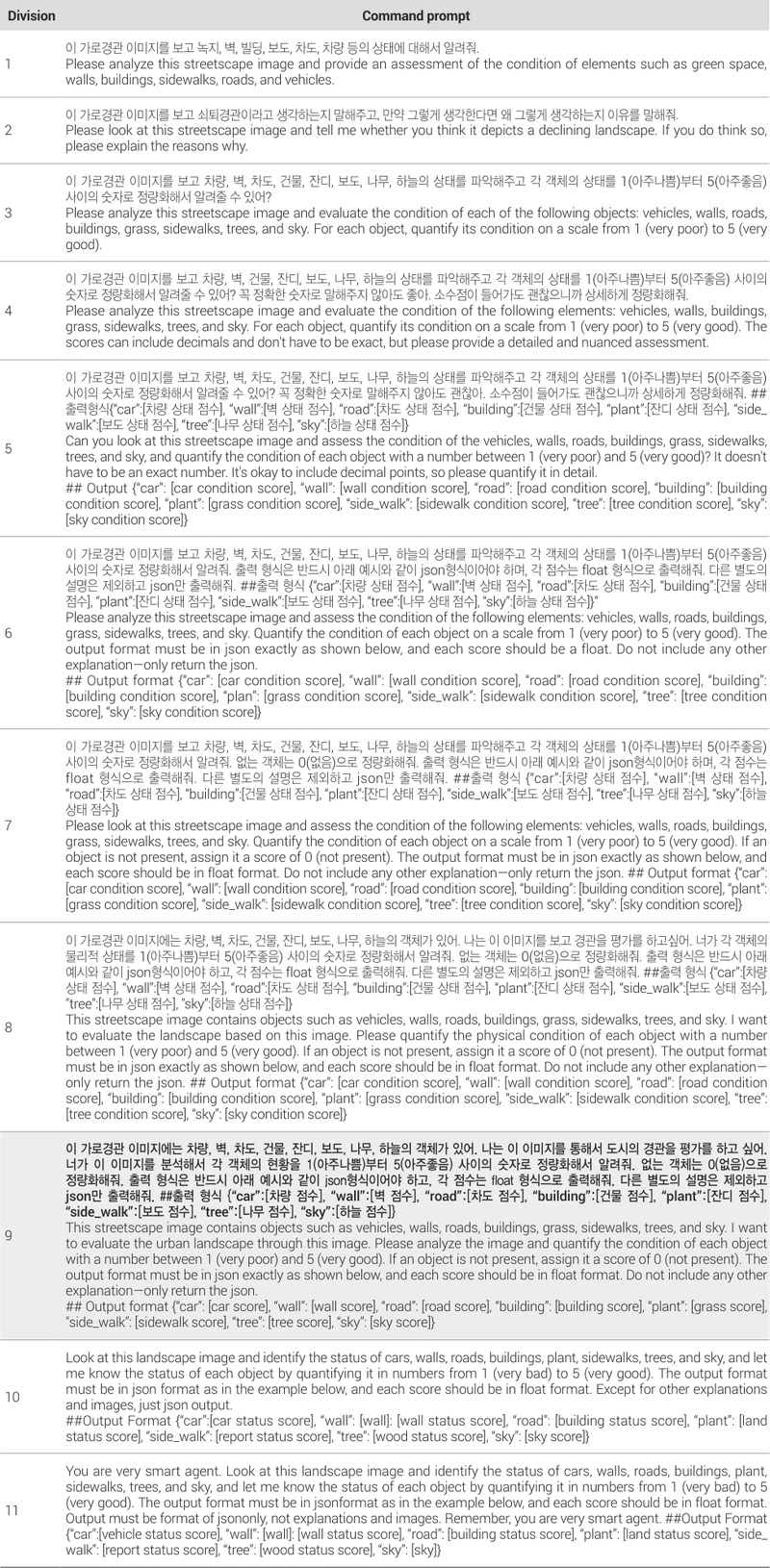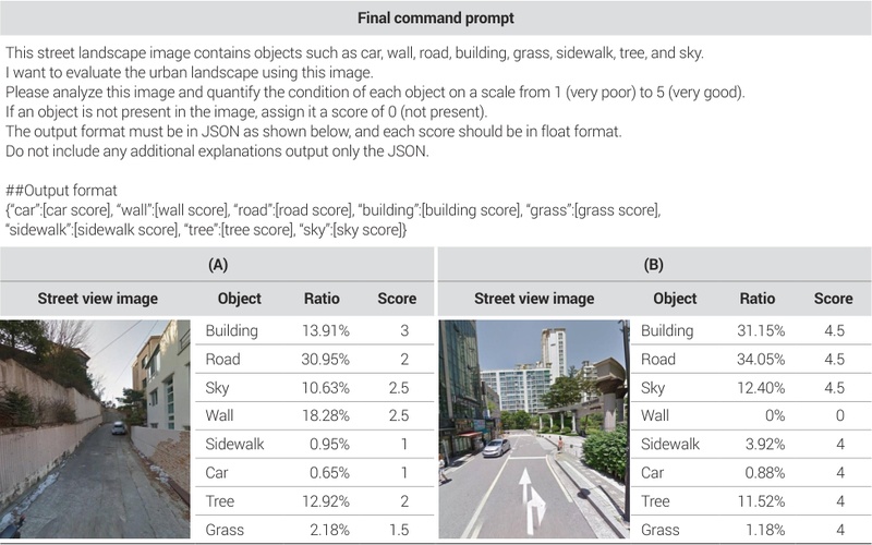 의미론적 분할은 물리적 환경을 비율로 인식할 수 있지만 객체의 상태는 알 수 없는 한계점이 존재한다. <표 2>와 같이 유사한 녹지 비율을 가지는 두 가로경관 이미지에서 MLLM을 통해 평가한 녹지 상태의 점수는 큰 차이를 나타내고 있다. 본 연구는 GPT-4o를 활용하여 가로경관 이미지 내 인식되는 물리적 환경 객체의 상태를 점수로 추출하였다. 이를 위해 실험한 프롬프트는 총 11가지이다(부록의 <표 1>). 최종적으로 선택된 프롬프트는 가로경관 이미지 내 인식되는 물리적 환경 객체의 상태를 점수로 평가하도록 설계되었다. 실험을 진행했던 11가지 프롬프트 중 모든 명령에 일관성 있게 결과를 도출하는 프롬프트는 9번째 프롬프트이기 때문에 최종적으로 연구에 활용하였다(표 2).