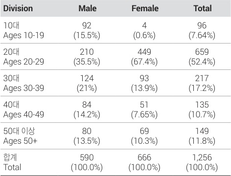 본 연구에서 진행한 설문조사 내용은 다음과 같다. “두 이미지 중 더 쇠퇴한 경관을 고르시오.”라는 지문이 제시되며, 응답자는 두 개의 이미지 중에서 더 쇠퇴하였다고 판단되는 이미지를 선택하게 된다. 선행연구에 따르면, 평균 약 20분 내외의 지속시간을 가지는 설문조사는 결과의 질에 유의미한 영향을 미치지 않는다(김권현 외, 2015). 이에 따라 총 10분이 넘지 않도록 사전 실험을 통하여 설문조사를 설계하였으며, 해당 시간 안에 완료될 수 있는 서른 쌍의 설문조사 이미지 세트를 구성하였다. 응답자의 개인 특성으로는 성별과 연령대 항목을 포함하였으며, 한 세트의 설문지는 총 30문항으로 구성되었다. 총 1,256명이 설문조사에 참여하였으며, 응답자의 성별과 연령대 특성은 <표 1>과 같다.