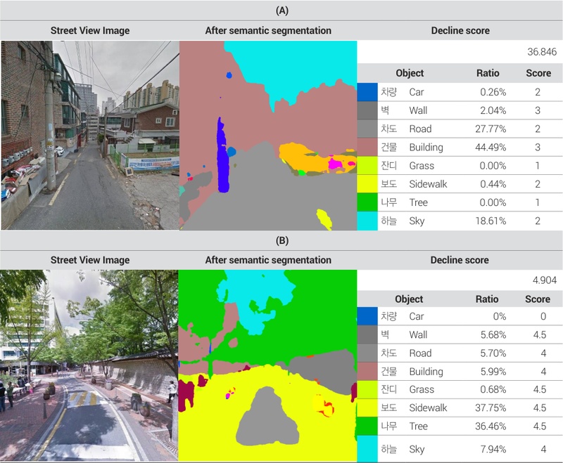다음 <표 4>는 인간이 가장 쇠퇴하였다고 인식한 경관(<표 4>의 (A))과 가장 쇠퇴하지 않았다고 인식한 경관(<표 4>의 (B))이다. 두 가로경관 이미지를 비교한 결과, 가장 쇠퇴하였다고 인식한 경관은 건물, 차도, 하늘, 벽 등의 순서로 비율이 높았으며 자연환경 요인은 검출되지 않았다. 또한, 가장 쇠퇴하지 않았다고 선택한 경관은 보도, 나무, 하늘, 건물 등의 순서로 비율이 높았다. 의미론적 분할 결과에 따르면, 인간은 자연적 환경과 인공적 환경이 적절한 비율로 이루어진 경관을 쇠퇴하지 않았다고 인식하는 것으로 나타났다. 또한, GPT-4o 점수에 따르면 인간이 쇠퇴하지 않았다고 판단한 경관의 GPT-4o 점수가 월등히 높게 평가되었다.