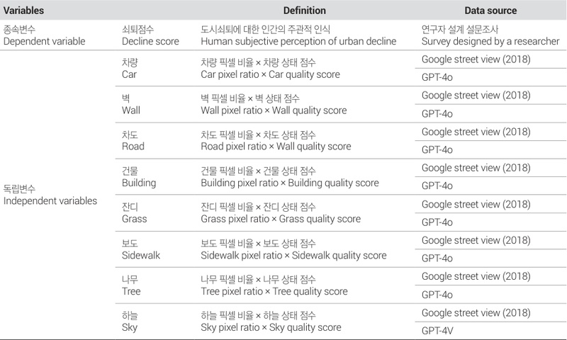 이를 위한 본 연구의 첫 번째 목적은 가로경관 이미지를 활용하여 서울특별시의 쇠퇴경관에 대한 인간의 인식을 분석하는 것이다. 다음, 두 번째 목적은 쇠퇴경관에 대한 인간의 주관적인 인식에 영향을 미치는 도시 내 물리적 환경요인을 분석하고자 한다. 이에 따른 본 연구의 질문은 다음과 같다: 첫째, 인간이 인식하는 쇠퇴경관에 영향을 미치는 물리적 환경요인은 무엇인가? 둘째, 물리적 환경요인과 쇠퇴인식 간에 비선형 관계가 존재하는가? 해당 연구 질문을 해결하기 위해 가로경관 이미지를 활용하여 도출한 쇠퇴경관에 대한 인간의 주관적 인식을 정량화하여 종속변수로 설정하였다. 또한, 쇠퇴경관에 대한 인간의 주관적 인식에 영향을 미치는 물리적 환경요인을 독립변수로써 구축하기 위해 의미론적 분할 기법과 멀티모달 대규모 언어모델을 활용하였다.