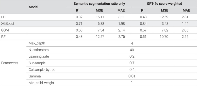 기계학습 모형의 성능을 비교하기 위한 지표는 R2, MSE, MAE를 사용하였다. R2는 독립변수가 종속변수를 얼마나 설명하는지를 평가하는 지표이다. MSE는 오차들의 평균을 의미하며 MAE는 오차 평균의 절댓값을 의미한다. 본 연구는 영향요인을 분석하기 위한 모형을 구축하기 때문에 R2가 가장 높은 기계학습 모형을 쇠퇴경관에 영향을 미치는 물리적 환경요인을 분석하기 위한 최종 모형으로 선정하였다. 또한, 본 연구에서는 GPT-4o 점수를 가중치로 적용한 변수를 독립변수로 활용하였으며 이를 심층적으로 평가하기 위해 의미론적 분할 비율만을 독립변수로 활용한 모형을 추가하여 두 모형의 설명력을 비교하였다. 그 결과, 두 모형 모두 XGBoost가 LR, GBM, RF보다 우수한 설명력을 가진 것으로 나타났으며 의미론적 분할 비율만을 독립변수로 적용한 모형보다 GPT-4o 점수를 가중치로 적용했을 때 모형의 설명력이 더 높아진 것을 확인하였다. 이는 물리적 환경 객체의 비율만 사용하여 쇠퇴경관을 분석하는 것보다 물리적 환경 객체의 비율과 상태를 모두 활용하여 쇠퇴경관을 분석하는 것이 정확한 분석이 가능함을 시사한다. 따라서 의미론적 분할 비율에 GPT-4o 점수를 가중치로 반영한 변수를 독립변수로 설정한 모형을 최종 모형으로 선정하였다.