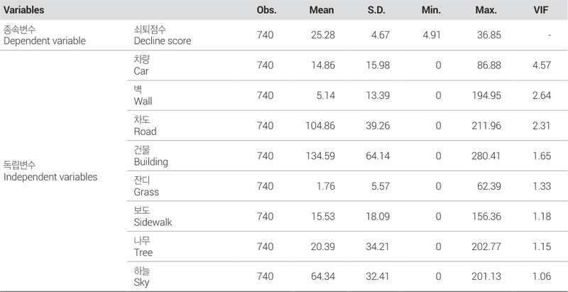 독립변수의 기술통계 분석 결과, 차량의 표준편차는 15.98로 높은 변동성을 보인다. 일부 경관에서 차량의 비중이 매우 높거나 거의 없는 경관이 있음을 의미한다. 벽은 평균값이 5.14이고 표준편차가 13.39로 나타나 상대적으로 낮은 비중을 나타내었다. 건물은 평균값이 134.59로 가장 높은 값을 나타내며 이는 건물이 차지하는 비중이 크다는 것을 의미한다. 반면에 잔디는 평균값이 1.76으로 매우 낮아 잔디의 비율이 다른 요인에 비해 현저히 낮음을 의미한다. 보도는 평균값이 15.53이고 표준편차가 18.09로 상대적으로 안정적인 분포를 나타내며, 경관에서 일정한 비율을 유지하고 있음을 시사한다. 나무의 평균값은 20.39, 표준편차는 34.21로 나타났으며 하늘은 평균값이 64.34, 표준편차는 32.41로 나타났다. 하늘은 비교적 높은 평균값을 나타내었으며 최댓값은 201.13으로 나타났기 때문에 일부는 폐쇄적인 경관을 보이는 반면, 다른 경관은 개방적인 환경임을 시사한다. 다음으로 다중공선성을 검토하기 위해서 분산팽창지수를 확인한 결과, 5를 초과하지 않아 다중공선성 문제가 없음을 확인하였다.