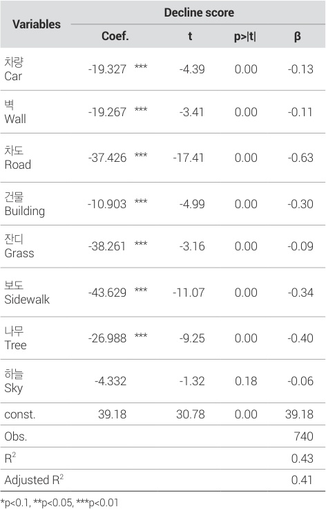 선형회귀 분석에 앞서, 각 변수의 평균, 표준편차, 최솟값, 최댓값을 확인하였고, 결과는 <표 7>과 같다. 종속변수는 주관적 쇠퇴경관 설문조사 결과에 Trueskill 알고리즘을 적용한 쇠퇴점수이다. 독립변수는 가로경관 이미지에 의미론적 분할을 적용하여 도출한 물리적 환경요인의 비율에 GPT-4o를 통해 도출한 물리적 환경요인의 상태 점수를 가중치로써 곱한 값이다. 기술통계 분석 결과, 종속변수인 쇠퇴점수의 평균값은 25.28로 나타났으며 표준편차는 4.67로 비교적 낮기때문에 지역 간 쇠퇴점수의 분포가 균등한 것이 확인되었다. 최솟값은 4.91, 최댓값은 36.85로 나타나 쇠퇴점수의 분포가 극단적이지 않고 안정적임을 알 수 있다. 이는 인간이 인식하는 서울시의 쇠퇴 수준 차이는 크지 않음을 시사한다.