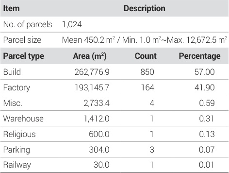 본 연구의 대상지는 2010년대에 들어 서울시의 주요한 업무·상업 중심지로 부상하고 있는 성동구 성수동 일대로, 성수동 복합업무지구의 중심이라고 볼 수 있는 지하철 2호선 성수역 남측 일대 약 76만 6천m2의 블록에 초점을 맞춘다. 대상지 전체는 준공업지역으로 지정되어 있으며 성수동의 중심상업가로로 인식되는 연무장길과 성수이로의 핵심 구간을 포함한다. 2023년 10월의 지적도를 기준으로 대상 구역 내 지목 도로, 공원, 학교용지를 제외한 총 1,044개 필지에 대해 자료를 구득했으며, 이 중 소유권 등기 정보가 제공되지 않는 20개 필지를 제외하여 정량분석은 최종적으로 1,024개의 필지를 대상으로 진행하였다(<그림 1>, <표 1> 참조).