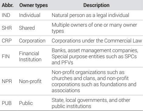 소유권에 따르는 법적인 책임과 권리를 구분하고 관련 규제와 조세 기준을 적절하게 적용하기 위해 부동산 소유권은 일반적으로 관련 법령에 근거한 취득 주체의 법적 지위에 따라 개인, 법인, 단체, 국가, 지방자치단체, 공공기관 등으로 분류된다. 본 연구에서는 경제적, 사회적 또는 제도적 여건에 따라 부동산을 보유하고 활용하는 목적과 방식이 다르다는 가정에 기반하여, 취득 주체를 개인, 공유, 법인, 단체, 금융기관, 국·공유·공공기관으로 분류하였다(<표 2> 참조).
