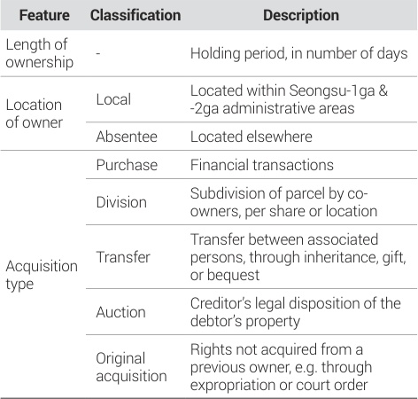토지등기부등본 데이터셋은 토지의 ‘활용성’에 주목하여 토지 소유권의 ① 온전한 이전, ② 온전한 소유권의 최초 분할 이전, ③ 지분 통합을 통한 온전한 이전에 의해 발생한 등기에 한하여 추출하였으며, 공유자 간의 개별 지분거래나 소유권이전청구, 압류 및 가압류 등의 등기사항은 제외하였다. 소유권 취득 주체 간 전반적인 부동산 취득 목적과 활용 경향의 차이를 보다 세부적으로 확인하기 위해, 선행연구를 바탕으로 ① 소유 기간, ② 부재지주 비율, ③ 소유권 변동 원인의 관점에서 대상지의 소유자 유형별 특성을 <표 3>과 같이 살펴보았다.