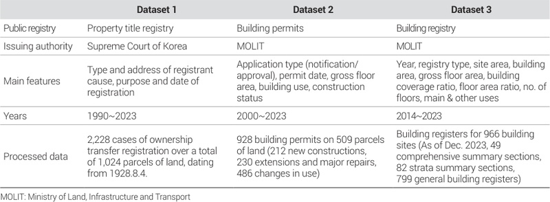 상술한 대로 건축인허가대장은 개별 건축행위의 신고 또는 허가에 따라 작성되므로 건축이 발생한 대지에 한정된 정보를 제공한다. 개발행위가 일어나지 않은 대지를 포함하여 대상지 전반의 소유 구조 변화와 토지이용 변화 간 상관관계를 살펴보기 위해, 대상지 내 전체 대지에 대한 건축물대장을 시점별로 구득하고, 건축인허가대장과 마찬가지로 각 대지의 소유자 변동 이력과 병합하였다. 본 연구에서는 2014년에서 2023년까지 각 연도별 12월 기준의 대장을 취합하였는데, 이는 곧 매 연말 기준 대상지 전체의 건축물 저량(stock)을 나타내는 자료이다.8) 병합된 자료를 사용하여 대상지 전체 및 소유자 유형별 보유 대지의 평균 용적률과 건축용도별 누적 연면적의 변화를 확인할 수 있으며, 이를 통해 각 소유자 유형이 지역의 토지이용 변화에 미친 영향력의 상대적인 강도를 파악할 수 있다.9) 이상 본 연구에서 사용된 세 개 데이터셋의 개요는 <표 4>와 같다.