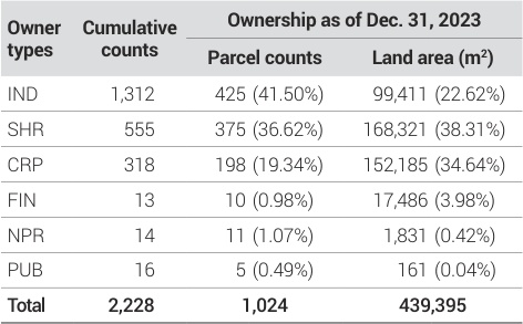 최초 취득일로부터 2023년 12월 31일까지 대상지의 소유권 변동 이력을 분석한 결과, 총 1,024개 필지에서 2,228건의 소유권 변동이 발생 하였으며, 취득 주체별 발생 건수와 2023년 12월 31일 기준 토지 보유 현황은 <표 5>와 같다. 2023년 12월 31일 현재 대상지 내에는 개인이 425개로 가장 많은 필지를 소유하며, 다음으로 공유가 375개 필지, 법인이 198개의 필지를 소유해 세 개의 소유자 유형이 전체 필지의 97.5%를 소유하고 있다. 면적 기준으로는 대상지 전체 면적의 95.6%에 해당하는 토지를 소유하는 대표적인 소유자 그룹으로 확인하였다.