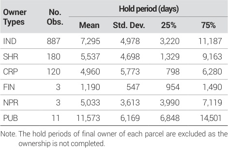 등기 기록상 최초 소유일부터 집계한 결과, 소유자 유형별 평균 소유 기간은 금융기관이 1,190일로서 가장 짧았고, 법인(4,960일), 단체(5,033일), 공유(5,537일), 개인(7,295일) 순으로 나타났다. 금융기관이 본격적으로 보유하기 시작한 2010년부터 동일기간을 기준으로 비교할 경우 평균 소유기간은 개인(1,495일), 금융기관(1,317일), 공유(1,283일), 법인(1,047일) 순으로 나타난다, 법인 유형의 소유기간이 개인 및 공유 유형 보다 상대적으로 짧은 것은 임윤환 외(2009), 김은택·김정빈(2017)에서 다루어진 것과 같이 소유 기간이 짧을수록 투기적 성향이 강하고 반대로 소유기간이 길어질수록 안정적인 임대수익이나 사용가치를 기대하는 경향이 강해지기 때문으로 해석할 수 있다,