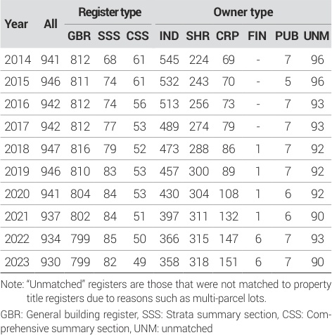 다음으로 등기부등본과 연도별 건축물대장 데이터를 병합해 2014년에서 2023년까지 대상지 전체의 토지이용 변화를 부동산 소유구조의 변화 관점에서 살펴보았다. 분석에 사용된 병합 데이터의 개요는 <표 8>과 같다. 건축인허가대장과 동일하게 소유권 유형 중 대지권은 공유자로 분류하였다.
