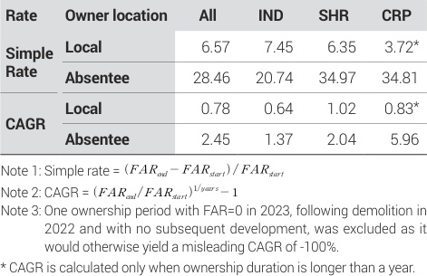 선행연구를 토대로 예상한 대로 부재지주는 전반적으로 거주지주에 비해 더 활발하게 개발을 추진했으며 이러한 차이는 특히 법인과 개인에서 뚜렷하게 나타난다. 전체 건축인허가 928건 중 거주지주가 369건, 부재지주가 559건을 취득했으며 이는 소유권당 각각 0.35건, 0.52건으로 확인된다. 세부적으로, 거주지주 대 부재지주 집단의 소유권당 평균 인허가 건수는 개인에서 0.21건 대 0.43건, 법인에서 0.57건 대 0.76건으로 두 집단에서 부재지주의 건축행위가 활발했다.