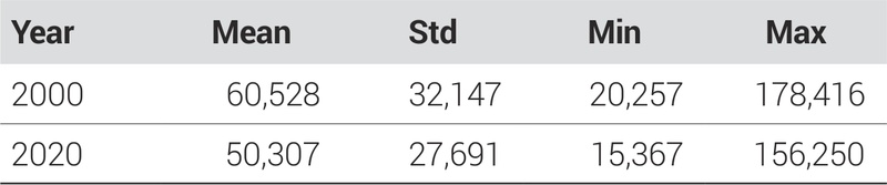 This study examines 77 depopulating municipalities identified under the 2021 “Special Act on Decentralization and Balanced Regional Development,” excluding metropolitan cities and islands due to their distinct population scales and conditions from the original 89 designated municipalities. The temporal scope of the analysis spans from 2000 to 2020, analyzing urban shrinkage patterns through time-series dynamic analysis. This study utilizes 500 m population grid data from the Statistics Geographic Information Service (SGIS) at five-year intervals. This grid-based approach enables separate estimation of populations in urban and non-urban areas, which would not be feasible with conventional municipal-level population data. The distinction between urban and non-urban areas follows the SGIS classification of Urban Centers and Urban Clusters. Urban Centers or Urban Clusters by SGIS are classified as urban areas, while all remaining areas are considered non-urban. These classifications are based on the United Nations’ urban classification standards.1) <Table 1> presents descriptive statistics of the population in the 77 depopulating municipalities for the years 2000 and 2020.