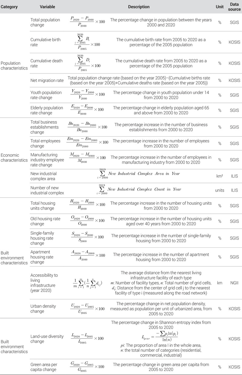 The third stage analyzes demographic, economic, and built environment characteristics across different shrinkage patterns. Variables were selected based on previous literature as shown in <Table 2>.