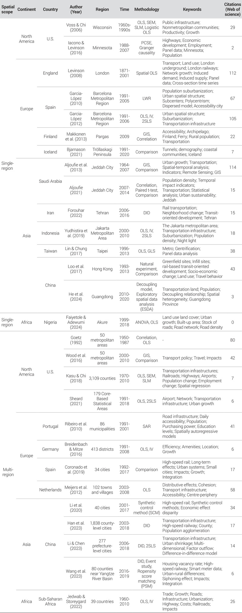 <Table 1> presents a descriptive overview of the reviewed journal articles, including their spatial scope, geographic focus, temporal coverage, methodology, keywords, and citation counts. Spatial scope is classified based on whether the analysis is confined to a single subnational administrative unit (e.g., state, province, or region) or extends across multiple subnational administrative units or national territories. This classification reflects the different scales used to examine the relationship between transportation infrastructure and population change, ranging from localized effects to broader regional dynamics. The studies also differ in their units of analysis, with some focusing on individual cities such as London, Barcelona, or Jeddah, and others on larger administrative units such as provinces, prefectures, or metropolitan regions. Most studies employ longitudinal data spanning 10 to 30 years, with some extending beyond five decades, underscoring a structural and cumulative understanding of transport-population dynamics rather than short-term fluctuations. A wide range of quantitative methods is applied, including ordinary least squares (OLS), spatial regression models (spatial OLS, spatial error model, spatial lag model), instrumental variable techniques (IV, 2SLS), panel data models (PCSE, GLS), and the difference-in-differences (DID) methods. These methodological approaches reflect increasing efforts to address spatial dependence, endogeneity, and causal inference. Citation counts based on Web of Science indicate varying levels of scholarly impact, from highly cited foundational works to more recent contributions reflecting emerging trends.