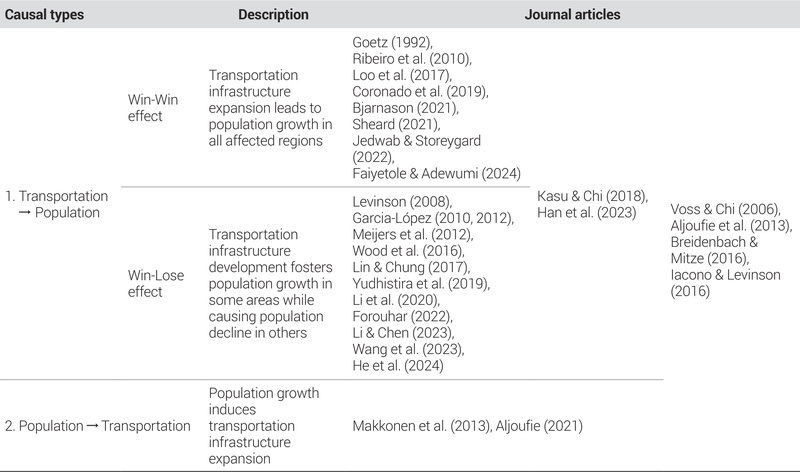 For this study, a systematic literature review was conducted, focusing on empirical studies retrieved from major international academic databases that examine the interaction between transportation infrastructure and population dynamics. The reviewed studies are classified into two main types. Type 1 includes research that analyzes the effects of transportation infrastructure on population change, which can be further subdivided into studies identifying Win-Win and Win-Lose effects. Type 2 consists of studies that examine how population change influences the provision and expansion of transportation infrastructure. This classification aims to clarify the conditions and directions of the relationship between transportation infrastructure and population change, and to derive relevant policy implications.
