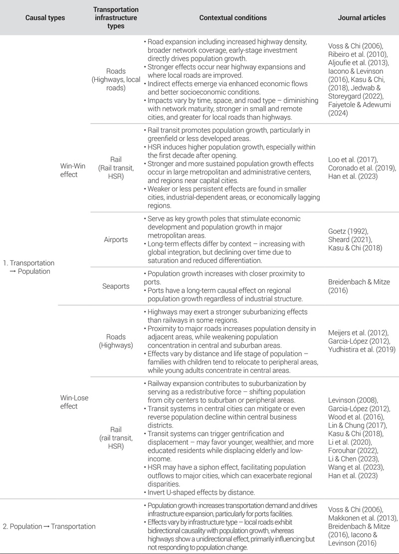 Studies examining the influence of population change on transportation infrastructure development (Type 2) can be categorized into two distinct scenarios. The first involves cases in which infrastructure expansion corresponds proportionally to population growth, thereby effectively accommodating increased mobility demands. The second scenario includes cases of mismatch, where infrastructure provision lags behind population growth, resulting in persistent congestion, overburdened networks, and spatial mismatches. These typological distinctions underscore that the responsiveness of infrastructure development to demographic shifts is not uniform, but is highly contingent upon regional socio-economic conditions and spatial planning contexts. The main findings of the systematic literature review are summarized in <Table 3> and are explained in detail in the following section.