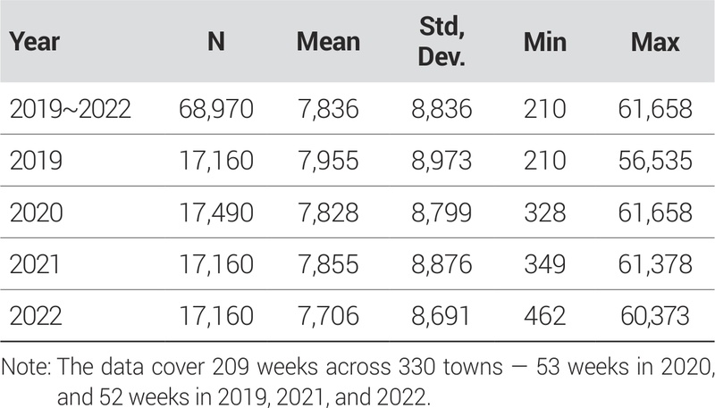 <Table 1> presents descriptive statistics on the weekly average active population per hour across towns from 2019 to 2022. The average active population for the entire period was 7,836, with a standard deviation of 8,836, indicating significant variability. The minimum value was 210, and the maximum value was 61,658, highlighting a wide distribution across towns and weeks. Yearly data indicate that the average active population was highest in 2019 at 7,955, followed by an overall declining trend. The standard deviation decreased in 2022 compared to 2019, suggesting reduced variability in the active population.