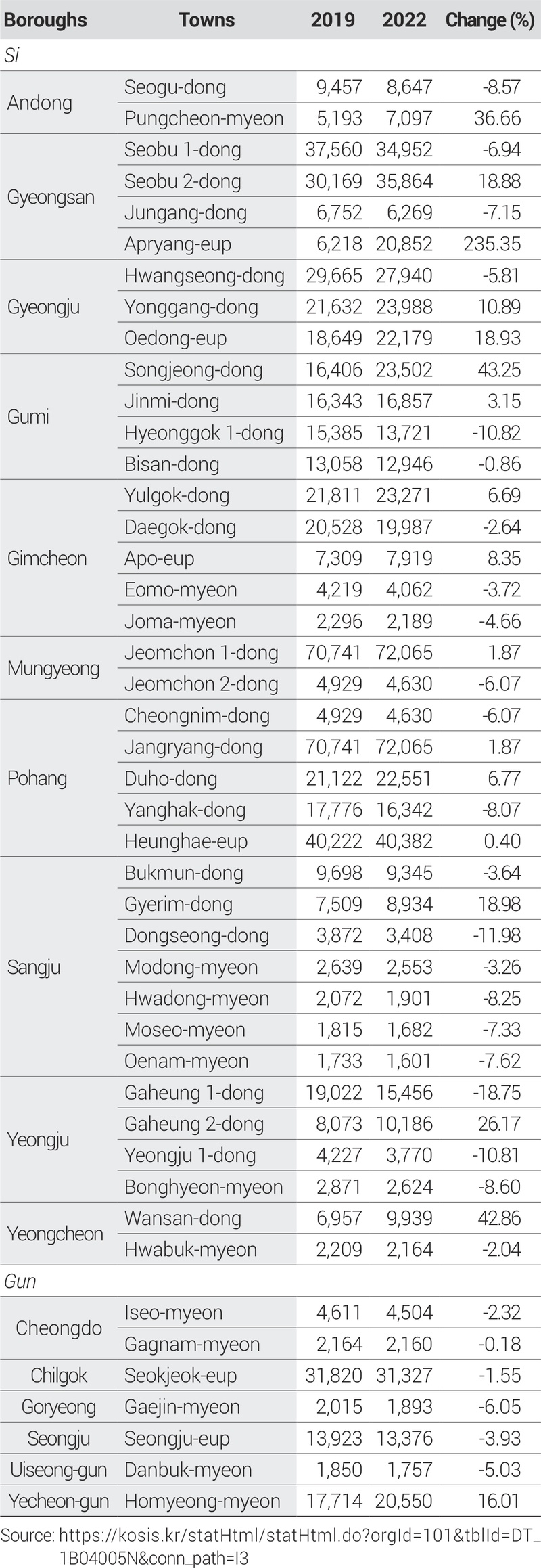 Despite their relatively small population sizes, some areas have developed as industrial complexes or agricultural centers, serving as important employment hubs. Notable examples include Modong-myeon in Sangju-si, which had a population of 2,553 in 2022, reflecting a 3.26% decrease compared to 2019. Eomo-myeon in Gimcheon-si recorded a population of 4,062 in 2022, a decline of 3.72% from 2019, while Seongju-eup in Seongju-gun had a population of 13,376 in 2022, marking a 3.93% decrease over the same period. These areas illustrate that even amid declining residential populations, employment-driven inflows can lead to an increase in the active population.