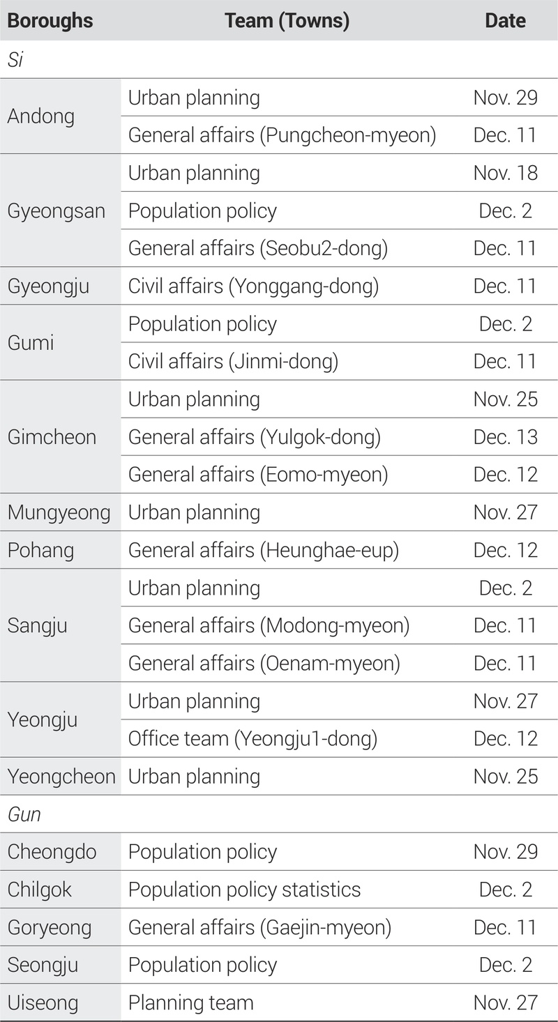 The study employed purposive sampling, a non-probability sampling method in which researchers select participants solely based on their relevance to the research objectives. This sampling method is widely recognized as an effective approach for achieving research goals (Yang et al., 2022). Interview participants were primarily selected as team leaders from urban planning or population policy departments within borough-level local governments. Additionally, deputy town leaders or general affairs team leaders were included at the town level. The interviews were conducted via telephone between November 18 and December 13, 2024. Boroughs and towns that declined to participate were excluded from the analysis. Consequently, as shown in <Table 3>, interviews were completed with 24 representatives from 15 boroughs, which falls within the recommended sample size of 15 to 30 interviews typically suggested for inductive content analysis (Ahmed, 2025).