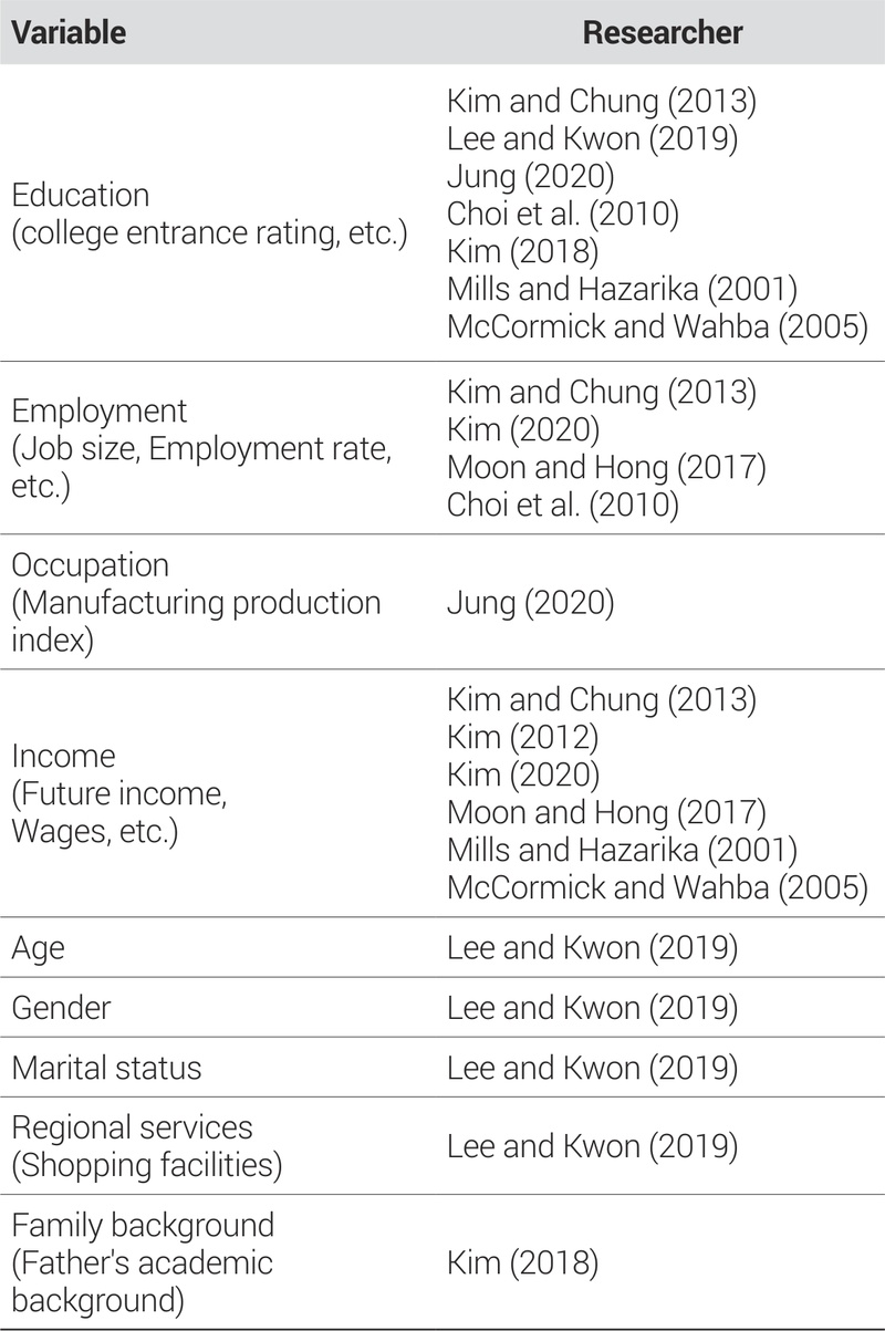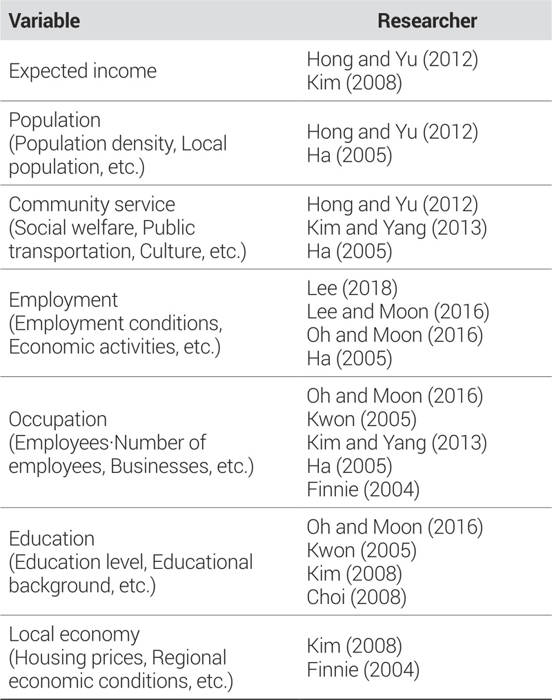 해외에서도 젊은 노동자들의 지역이동 동기 및 대도시에 거주하고자 하는 요인과 관련하여 다양한 연구가 진행되고 있다(Mills and Hazarika, 2001; McCormick and Wahba, 2005). Mills and Hazarika(2001)는 비수도권에서 다른 비수도권, 혹은 수도권으로의 청년 이주 상황을 조사하여 청년 노동자들이 초기 소득으로 기대하는 이득이 지역이동에 영향을 미치며 초기 수익의 증가는 부분적으로 학교 교육으로 이어진다는 결과를 도출하였다. 교육을 받은 사람들과 젊은 사람들이 대도시로 이동하는 데 ‘위치적 선호’가 어떤 영향을 미치는지에 대하여 연구한 McCormick and Wahba(2005)는 대도시로 이주하는 사람들은 도시에서 받을 수 있는 임금수준을 고려하는 경향이 있으며, 이 때 도시에 거주하며 얻는 편익이 더 크다고 인식한다는 것을 실증적으로 보여주었다. 이를 통해, 교육 관련 정책이 증가될수록 대도시에서의 고용률이 증가한다는 결과를 도출하여 국내뿐만 아니라 해외에서도 임금 및 교육을 위해 대도시로 이동하고자 하는 사람들이 계속하여 증가하고 있음을 보여주었다. 이와 같은 청년들의 이동에 영향을 주는 변수들을 정리하면 <Table 2>와 같다.