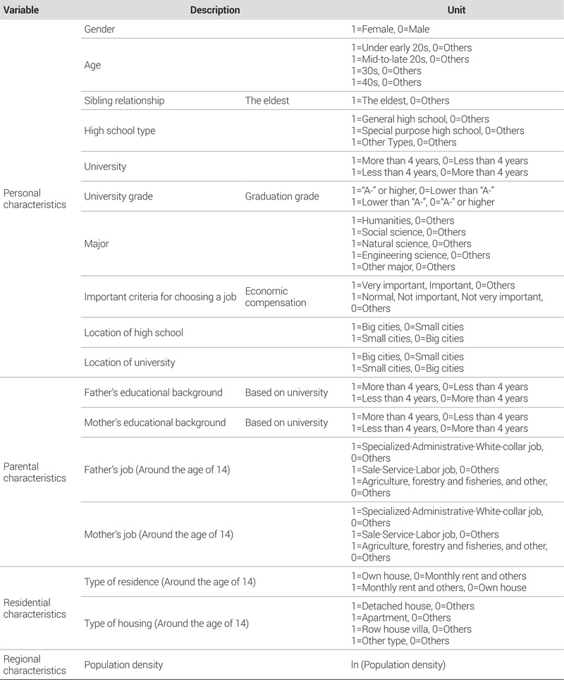 부모의 교육수준 등 부모의 특성이 비수도권 성장 청년의 직장 소재지와 상관관계가 있다는 기존 연구를 바탕으로(권오규·마강래, 2012) 만 14세 무렵부터 청년이 된 후 대도시로의 이동 여부와 상관관계가 있을 것으로 예측되는 부모님의 특성 및 주거 관련 특성을 변수로 추가하고자 하였다. 이러한 특성이 실질적으로 상관관계가 있는지 파악하기 위하여 아버지 학력, 어머니 학력, 만 14세 무렵 아버지 직업, 만 14세 무렵 어머니 직업, 만 14세 무렵 주거 형태, 만 14세 무렵 주택 형태 변수를 이용하였다.