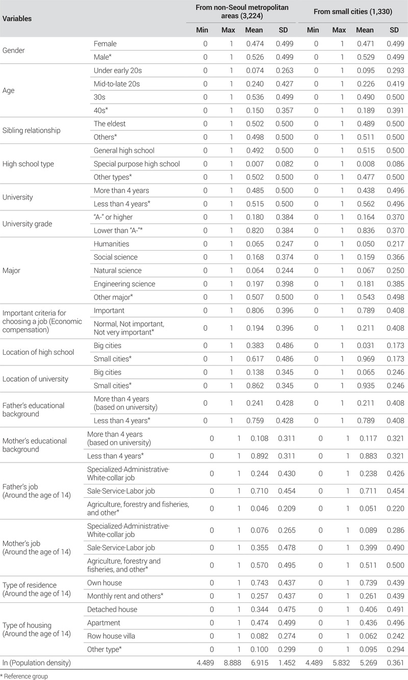 마지막으로 지역특성이 지방 출신 청년들의 지역이동과 상관관계가 있는지 파악하기 위해서 청년들이 만 14세에 거주한 지역의 당시 인구밀도 변수를 사용하였다. 인구밀도 자료는 e-나라지표 ‘지역별 인구 및 인구밀도 자료1)’를 사용하였으며, 각 청년들이 만 14세였던 시기와 당시 거주한 지역을 파악하여 변수를 구성하였다. 이 과정에서 계숫값의 크기 조정을 위하여 자연로그(ln)를 취해 주었다.