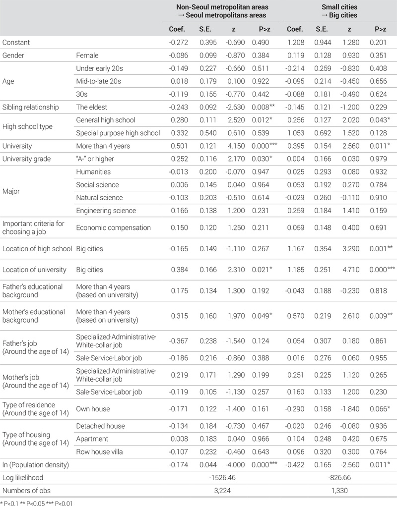 장남 및 장녀일 경우 수도권으로의 이동에 음(-)의 상관관계가 있는 것으로 나타났다. 이는 장손으로 태어난 청년들은 장손이 아닌 청년들에 비해 수도권으로 이동하지 않고 비수도권에 계속 거주할 확률이 높다고 해석할 수 있다. 고등학교 종류의 경우, 일반·인문계가 수도권으로의 이동에 양(+)의 상관관계가 있는 것으로 나타났다. 반대로 해석하면, 특목고나, 일반·인문계 고등학교가 아닌 기타 다른 고등학교를 졸업한 청년의 경우 비수도권에서 자라서 비수도권으로 취업할 확률이 높다고 할 수 있다. 지역 변수를 살펴본 결과, 인구밀도가 수도권으로의 이동에 음(-)의 상관관계가 있는 것으로 나타났다. 이는 청년들이 성장한 지역의 인구밀도가 높아질수록 수도권으로 이동하여 취업해야 할 필요성이 느끼지 못하고 비수도권에서 계속하여 거주함을 의미한다. 즉, 성장지역의 도시규모가 청년들의 이동에 영향을 준다고 볼 수 있다.