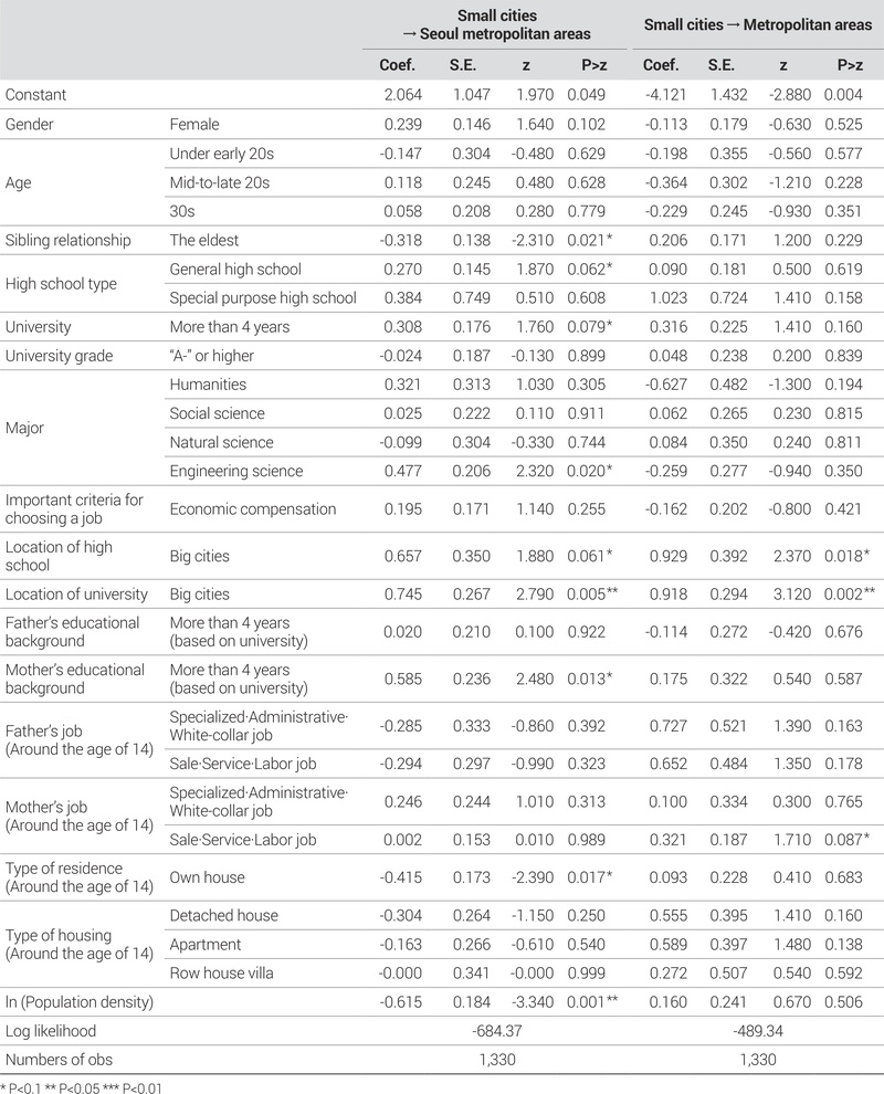 마지막으로 지역변수를 살펴본 결과, 인구밀도는 지방도시에서 성장한 청년들의 수도권으로의 이주에 음(-)의 영향을 주는 것으로 나타났다. 이러한 결과는 <Table 5>에서 나타난 비수도권에서 성장하여 수도권으로, 그리고 지방도시에서 성장하여 대도시로 이동한 효과와 유사하다고 할 수 있다. 즉, 지방도시 중에서도 규모 및 경제가 크면 청년들은 수도권으로 이동하지 않고 거주지역 내에서 취업 및 생활할 수 있는 방법을 찾을 확률이 높아짐을 의미한다.