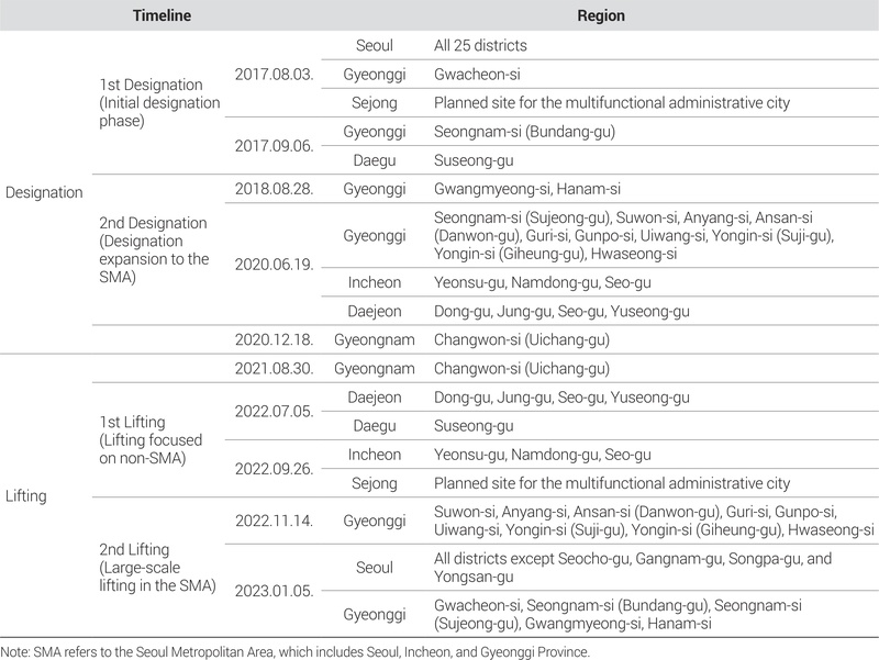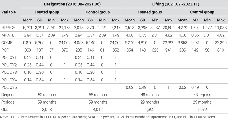 본 연구의 분석기간은 지정 정책의 경우 2016년 8월부터 2021년 6월까지, 해제 정책의 경우 2021년 7월부터 2023년 11월까지이다. 각 정책의 효과를 시행 시점을 기준으로 전후 12개월 동안 식별하기 위해, 1차 지정(2017년 8월)은 2016년 8월부터 2018년 8월, 2차 지정(2020년 6월)은 2019년 6월부터 2021년 6월까지 분석에 포함하였다. 해제 정책 또한 동일한 기준에 따라, 1차 해제(2022년 7월)는 2021년 7월부터 2023년 7월, 2차 해제(2022년 11월)는 2021년 11월부터 2023년 11월까지를 각각 분석기간으로 설정하였다. 이와 같은 구분은 각 정책의 효과가 시간에 따라 어떻게 변화하는지를 보다 명확히 식별할 수 있도록 설계된 것이다.