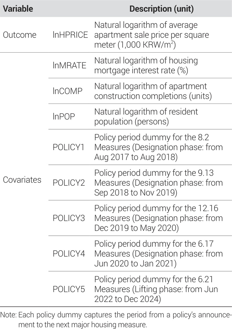 <Table 2>는 분석에 사용된 변수들을 보여준다. 결과변수는 한국부동산원의 전국주택가격동향조사에서 집계된 지역별 월평균 아파트 단위매매가격이며, 자연로그 취한 값(lnHPRICE)을 분석에 사용하였다. 공변량은 금리, 공급, 수요, 정책 요인을 포함하며, 각각 주택담보대출 금리(lnMRATE), 아파트 준공물량(lnCOMP), 주민등록인구(lnPOP)에 자연로그 취한 값을 사용하였다. 정책변수는 2017년 이후 발표된 주요 부동산 대책의 외생적 영향을 통제하기 위해 설정되었으며, 각 변수는 해당 정책 발표 이후 다음 주요 대책 발표 직전까지의 기간을 1로 설정한 더미 변수로 구성된다. 첫 번째 주요 정책(POLICY1)은 2017년 8·2 대책으로, 투기과열지구의 대폭 확대 및 LTV·DTI 강화 등 수요 억제 조치가 중심이다. 두 번째 정책(POLICY2)은 2018년 9·13 대책으로, 다주택자에 대한 종합부동산세 인상과 대출 규제를 강화하여 보유 부담을 높인 정책이다. 세 번째 정책(POLICY3)은 2019년 12·16대책으로, 고가주택에 대한 추가 대출 제한과 진입 차단을 주요 내용으로 한다. 네 번째 정책(POLICY4)은 2020년 6·17 대책으로, 수도권 전역으로 규제 확대와 법인 거래 제한이 핵심이다. 다섯 번째 정책(POLICY5)은 2022년 6·21 대책으로, 투기과열지구 대규모 해제를 포함한 규제 완화 정책이다.