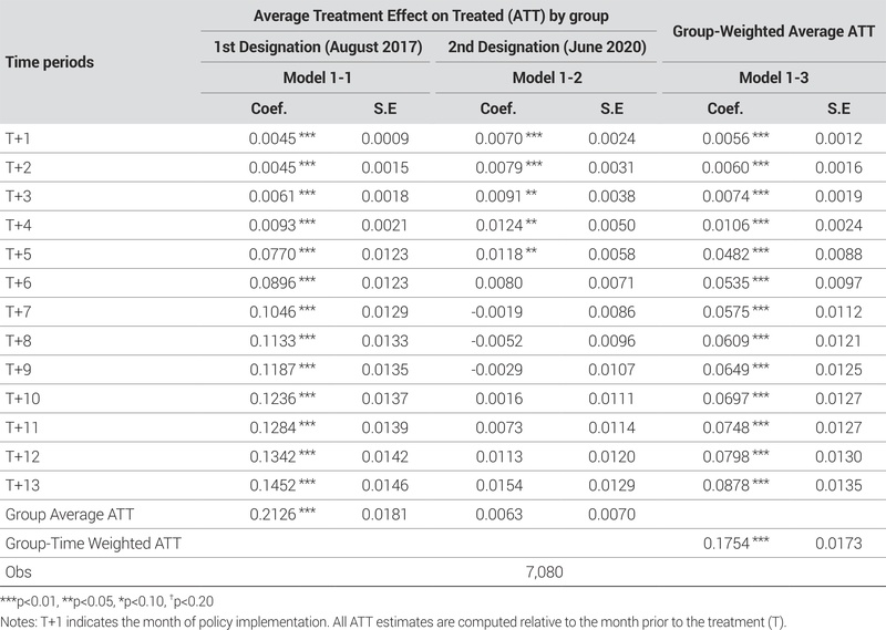 이를 종합하여, 표본 비중을 반영한 그룹 가중평균처치효과(Group-Weighted Average ATT)를 살펴보면, 지정 정책 전반이 주택가격에 유의한 영향을 미친 것으로 나타났다. Model 1-3의 추정 결과에 따르면, 정책 시행 이후 12개월에 걸친 월별 효과는 모두 양(+)의 방향이며, 통계적으로 유의하게 나타났다. 전체 표본에 대한 그룹-시점 가중 평균처치효과(Group-Time Weighted Average ATT)는 0.1754로 추정되며, 이는 정책 시행 이후 지정 지역의 주택가격이 평균적으로 약 19.2% 상승했음을 의미한다. 이는 1차 지정 지역의 높은 상승효과가 전체 평균 효과를 견인했으며, 반면 2차 지정 지역은 상대적으로 낮거나 유의하지 않은 효과를 보였음에도 불구하고, 전체 효과는 여전히 유의한 수준의 상승으로 귀결되었음을 시사한다.