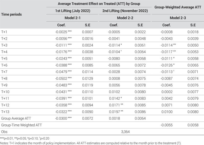 분석 결과, Model 2-1의 추정치에 따르면 1차 해제 정책은 주택가격에 유의한 하락 효과를 유발한 것으로 나타났다. 정책 해제 이후 첫 달(T+1)을 포함하여 이후 모든 월별 평균처치효과 계수는 음(-)의 방향이며, 전 구간에서 1% 유의수준 내에서 통계적으로 유의한 것으로 나타났다. 특히 정책 시행 이후 7개월 후(T+8)까지는 계수의 절댓값이 점진적으로 증가하는 경향을 보이며, 이는 해제 조치 이후 주택가격이 지속적으로 하락하는 누적 경로를 형성했음을 보여준다. 다만 8개월 후(T+9)부터는 계수의 절댓값이 다소 감소하거나 유지되면서, 가격 하락 폭이 완화되거나 효과가 정체되는 양상이 나타난다. 1차 해제 정책의 그룹 내 평균처치효과(Group Average ATT)는 -0.03으로 추정되었으며, 이는 아파트 단위매매가격의 자연로그를 종속변수로 사용한 것을 고려할 때, 실제 가격 기준으로는 약 2.95%의 하락을 의미한다. 즉, 정책 시행 이후 해제 지역에서 평균적으로 약 3%에 가까운 주택가격 하락이 유의하게 발생한 것으로 해석된다.