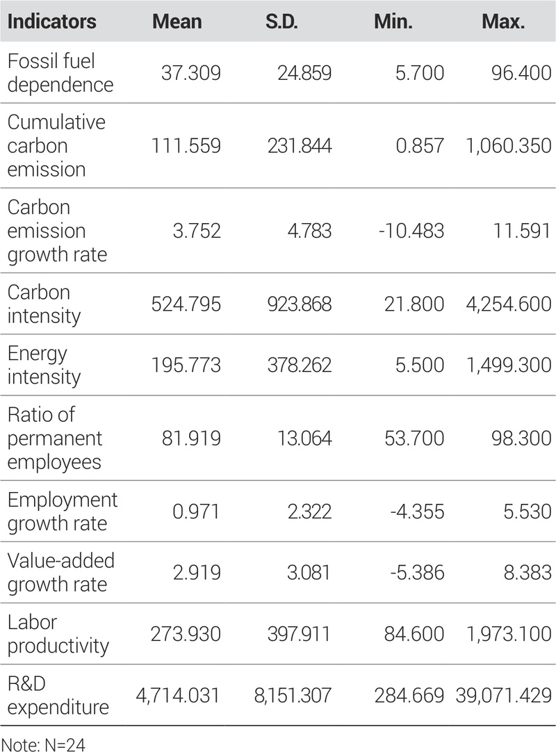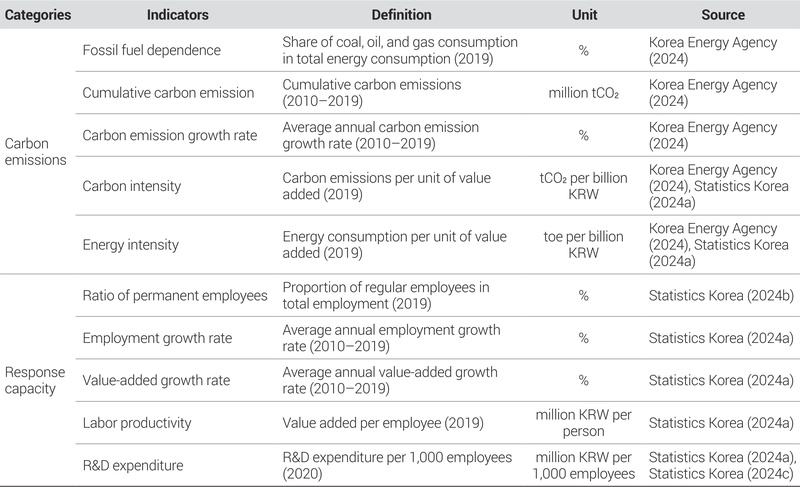 분석의 시간적 범위는 2010년부터 2019년까지로 설정하였는데, 이는 2020년 이후 코로나19로 인한 경제적 영향이 자료의 변동성을 왜곡할 가능성이 있기 때문이다. 다만 자료의 한계로 인해 업종별 연구개발비는 2020년을 기준으로 하였다. 업종 구분은 제10차 한국표준산업분류의 중분류 기준을 적용하였다. 업종별 탄소배출량과 에너지소비량 자료는 국가온실가스 배출량 종합정보시스템의 연도별 산업부문 온실가스 배출량 조사보고서에서 구득하였다. 업종별 상용근로자 수는 「전국사업체조사」, 종사자 수와 부가가치액은 「광업제조업조사」, 연구개발비는 「경제총조사」를 활용하였다.