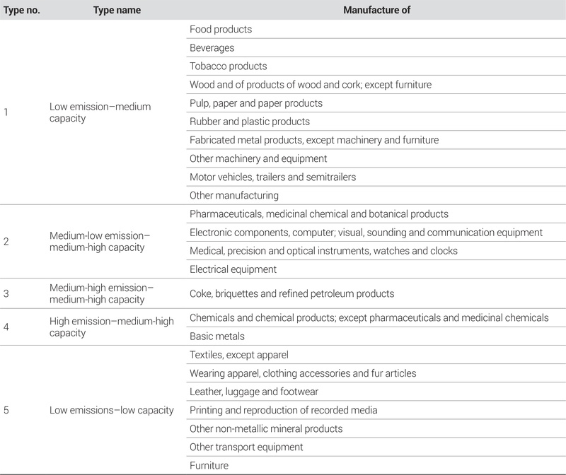 군집분석 결과를 바탕으로 탄소배출 부문 중 평균 이상인 지표가 5개인 경우 저배출, 4개인 경우 중·저배출, 2~3개인 경우 중배출, 1개인 경우 중·고배출, 0개인 경우 고배출로 분류하였다. 마찬가지로 대응 역량 부문도 고역량과 중·고역량, 중역량, 중·저역량, 저역량으로 분류하였다. 이에 따라 유형 1은 저배출-중역량 산업, 유형 2는 중·저배출-중·고역량 산업, 유형 3은 중·고배출-중·고역량 산업, 유형 4는 고배출-중·고역량 산업, 유형 5는 저배출-저역량 산업으로 명명하였다. 각 유형에 속하는 업종은 <표 3>으로 제시하였다.