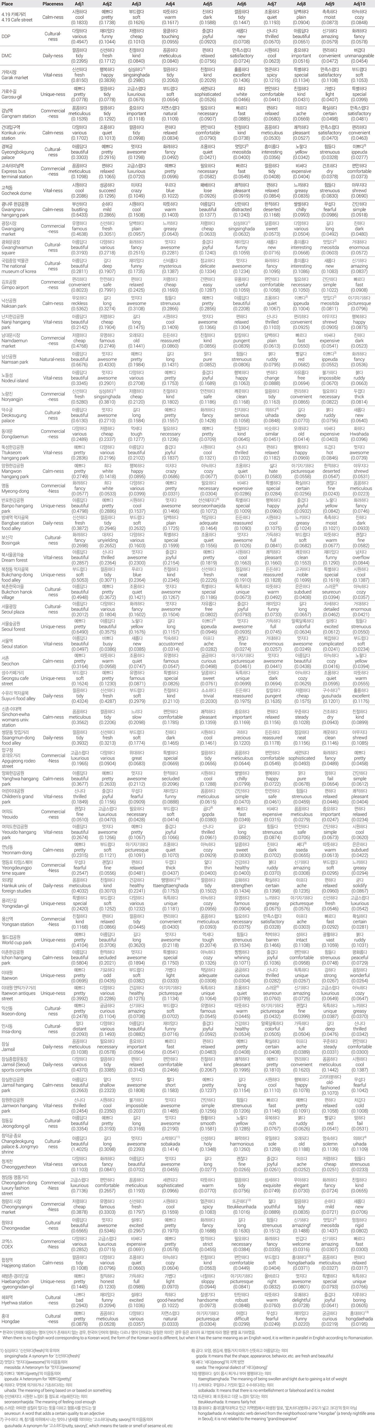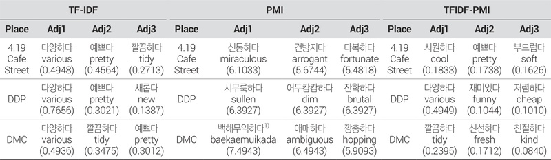 Term Frequency-Inverse Document Frequency (TF-IDF) 방법은 문서 내에서 특정 단어의 출현 빈도를 기반으로 해당 단어의 중요도를 측정하는 대표적인 텍스트 마이닝 기법이다(Quan and Ren, 2014). 단어 빈도(Term Frequency, TF)와 해당 단어가 전체 문서에서 얼마나 드문지를 나타내는 역문서 빈도(Inverse Document Frequency, IDF)를 곱하여 개별 단어가 전체 문서에서 얼마나 중요한지 확인할 수 있다(김예림·성종상, 2023). 그러나 TF-IDF의 한계점으로는 가공된 단문(short text)에서는 정보가 충분치 않아 변별력이 떨어진다는 점이 있다(Georgieva-Trifonova, 2021). 본 연구는 수집한 텍스트 데이터 중 형용사만을 추출하므로 일반적인 TF-IDF 방법을 사용할 경우, 대부분의 장소에서 특징적이지 않은 형용사가 도출된다(<표 7> 참조).