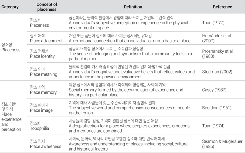 Tuan(1977)은 저서 「공간과 장소」에서 공간이라는 물리적 환경에 경험과 삶이 녹아들 때 그곳은 장소가 된다고 하였다. 사람은 장소에 주관적인 가치를 부여하며 사람마다 서로 다른 인식을 갖는데, 이를 ‘장소성(placeness)’이라고 한다. 따라서 장소는 객관적이거나 중립적인 곳이 아니라 사람들에 의해서 의미로 채워지며(Relph, 1976), 이는 장소의 정체성으로 발전할 수 있다.