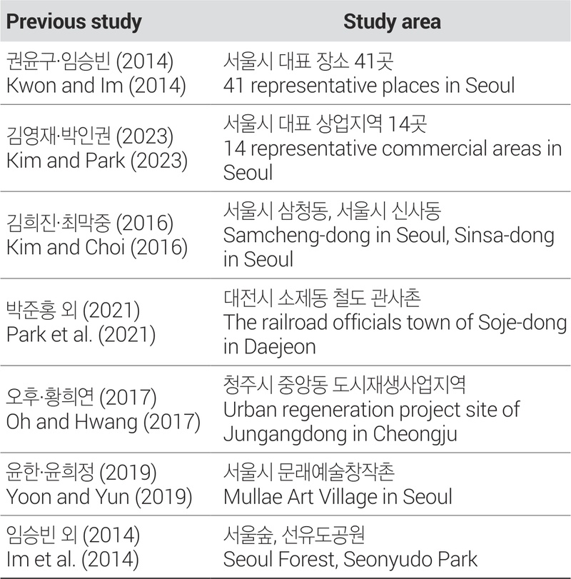 기존의 선행연구를 검토한 결과(<표 2> 참조), 소제동 철도관사촌(박준홍 외, 2021), 도시재생 사업지(오후·황희연, 2017), 문래예술창작촌(윤한·윤희정, 2019) 등과 같이 다소 미시적 관점에서 특정 장소나 도시, 지역 계획에 대해 장소성을 파악한 연구가 대부분임을 확인하였다(이인아·김혜진, 2019). 이렇게 연구 대상을 둘 이하로 한정하는 경우, 연구 대상에서 나타난 장소성을 다른 대상과 비교하기 어렵고, 그 대상만의 특징적인 것인지, 혹은 다른 원인으로 인해 비슷한 대상에서 공통으로 나타나는 것인지 파악하기에 적합하지 않다. 또한, 여러 장소를 대상으로 장소성을 분석한 소수의 연구에서는 장소성 토픽을 정의하는 데 연구자의 주관이 강하게 반영되어 객관성이 떨어지고, 토픽의 범위가 한정적이라는 한계가 있다(권윤구·임승빈, 2014; 김영재·박인권, 2023).