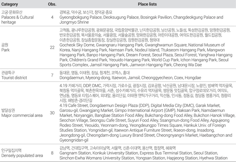 연구의 공간적 범위는 서울특별시 내 주요 장소 71곳이다(<그림 3> 참조). 먼저 서울특별시는 대한민국의 수도로서 가장 많은 이동 및 방문이 발생하는 지역이므로 연구 지역으로 적절하다고 판단하였다. 장소 선정에서 객관성을 확보하기 위하여 서울 열린 데이터 광장의 서울 실시간 도시데이터(2024)에서 선정한 서울시 내 주요 장소(관광특구, 공원, 고궁·문화유산, 발달상권, 인구밀집지역) 116곳을 공간적 범위로 채택하였다. 116곳 전체를 대상으로 데이터를 수집한 후, 수집된 데이터가 현저히 적거나(outlier), 장소성이 있다고 보기 어려운 일반 지하철역 등을 제외하여 총 71곳의 대상지를 선정하였다(<표 3> 참조). 시간적 범위로는 네이버 블로그의 지오태깅 기능이 업데이트된 이후, 가장 최근 시점인 2024년을 선택하였다.