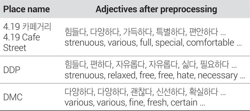 다음으로 한국어 형태소 분석기인 KoNLPy의 Okt를 활용해 텍스트를 형태소 단위로 분석하여(권준현·이수기, 2023), 단어를 모두 기본형으로 변환하고 그중에서 형용사를 분리하여 추출하였다. 본 연구와 같이 장소성을 파악하기 위해 형용사를 사용하는 것은 장소의 의미와 특성 등 장소 이미지를 분석하기 위한 도구로서 다양한 연구에서 이미 사용된 바 있다(Zube, 1973; Steele, 1981; 강도원·최창규, 2012; 권윤구·임승빈, 2014; Choi et al., 2017). 전처리 후 정리된 데이터의 예시는 <표 6>에 제시하였다.