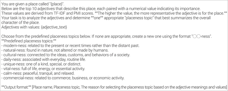 장소별로 도출된 TFIDF-PMI 상위 10개의 형용사를 바탕으로 장소성 토픽을 정의하기 위해 LLM인 GPT-4o-mini를 사용하였다. GPT-4o-mini는 자연어 이해와 생성 능력을 갖춘 모델로서, 맥락을 고려한 텍스트 분석과 개념 정의에 뛰어난 성능을 보인다. 특히 주어진 목록을 기반으로 특정 개념을 정리하거나, 기존 분류 체계에 맞지 않는 경우 새로운 키워드를 제안하는 데 활용될 수 있다. 이는 연구자의 주관적 편견을 배제하고 일관된 기준으로 대량의 장소를 분류할 수 있는 방법론적 이점을 제공한다.