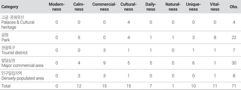 장소성 토픽 결과는 다음과 같다. 관광특구는 내·외국인 관광객이 모두 자주 방문하는 장소로서 7곳 중 3곳의 장소성 토픽이 상업성으로 나타났으며, 문화성, 일상성, 특이성, 활력성이 각각 1곳씩 도출되었다. 분석 대상지 중 공원은 모두 22곳이었으나 자연성 토픽이 도출된 곳은 1곳이었고, 대체로 활력성에 집중되었다.