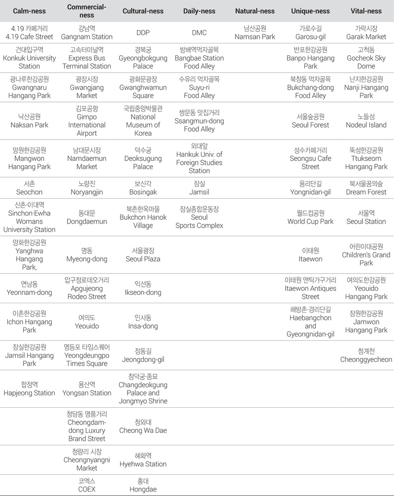 가장 많은 장소에서 나타난 장소성 토픽을 토대로 서울시 주요 장소들의 전반적인 성격을 상업성과 문화성으로 파악할 수 있다 (<표 11> 참조). 서울 내 교통 요지로 꼽히는 강남역, 고속터미널역, 김포공항, 서울역, 잠실은 상업성 3곳, 활력성 1곳, 일상성 1곳으로 도출되어 인구 이동이 빈번한 곳에서 상업 활동이 활발히 이루어짐을 확인하였다. 경복궁, 덕수궁, 보신각, 북촌한옥마을, 정동길, 창덕궁·종묘, 청와대 등 역사적 성격을 가진 장소에서는 모두 문화성이 도출되었다. 가로수길, 경리단길, 용리단길, 성수 카페거리와 같은 신흥 상권에서 특이성이 도출된 것을 토대로 사람들의 발길을 이끄는 곳은 개성 있고 특징적인 장소임을 실증적으로 입증하였다. 이어서 자연성이 도출된 공원은 ‘남산공원’ 1곳에 그친 반면, 정온성이 도출된 공원이 5곳, 활력성이 도출된 공원은 8곳이었다. 이는 이용자들이 서울시 주요 공원을 자연적 공간보다는 휴식과 활동 위주의 장소로 인식하고 있음을 보여주며, 더 나아가 도시 내에서 충분한 자연적 경험을 얻지 못하고 있음을 시사한다.