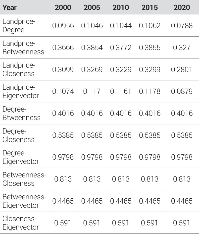 가설 1(구조적-경제적 탈동조화): Castells(1996)의 흐름의 공간 이론에 따라, 교통 인프라의 발달과 경제활동의 탈공간화로 인해 구조적 중심성과 경제적 중심성 간의 상관관계가 시간이 지남에 따라 약화될 것이다.