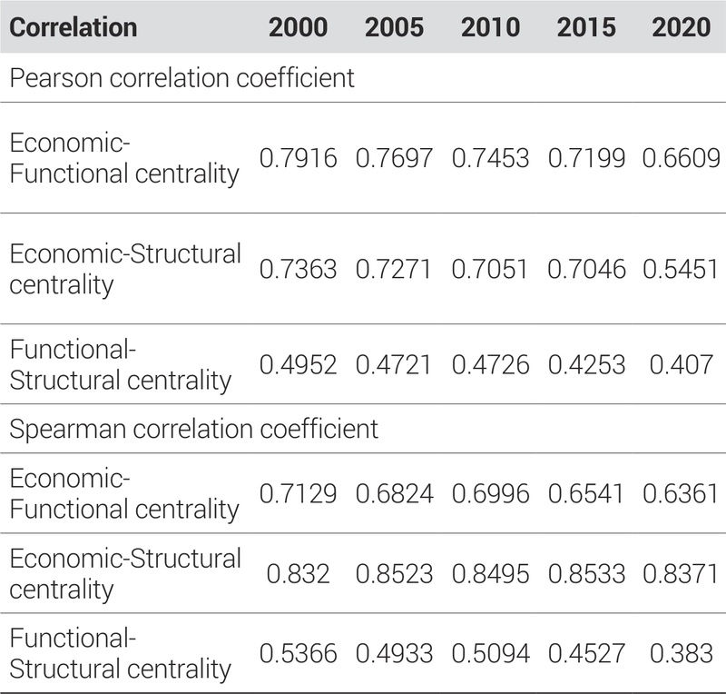 가설 2(기능적-경제적 연계성 지속): Pred(1977)의 행동적 공간 이론에 따라, 기능적 중심성은 실제 통행 패턴을 반영하여 경제적 중심성과 높은 상관관계를 유지하나, 구조적 중심성은 네트워크 위치 특성으로 인해 상대적으로 독립적인 패턴을 보일 것이다.