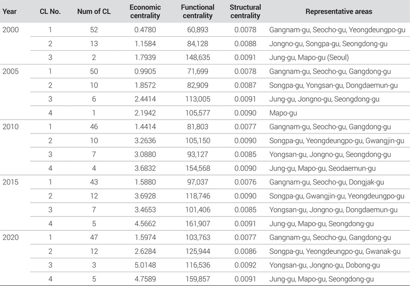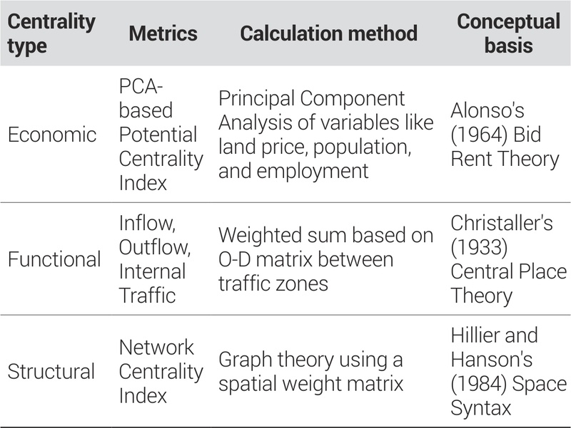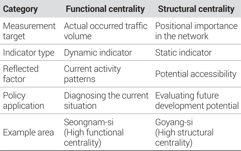 수도권 다핵화 과정에서 나타나는 중심성의 다차원적 변화를 포착하기 위해 경제적, 기능적, 구조적 중심성을 각각 차별화된 방법론으로 측정하였다. 각 중심성은 서로 다른 이론적 기반과 측정 원리를 가지므로, 이들 간의 분화 현상을 정확히 파악하기 위해서는 개념적 순수성을 유지한 측정이 필수적이다(표 1, 표 2).