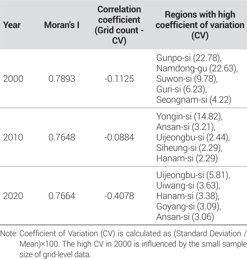 2000년부터 2020년까지의 경제적 중심성 지수 변화를 분석한 결과, 수도권 내에서 뚜렷한 단계적 변화 양상을 확인할 수 있었다. 분석 기간을 세 단계로 구분하여 살펴보면 다음과 같다. 집적 단계(2000-2005)에서는 서울 도심과 강남 지역으로의 경제적 집중 현상이 심화되었다. 이 시기 상위 5개 중심지(강남구, 서초구, 종로구, 중구, 영등포구)의 경제적 중심성 지수 합이 전체의 45.2%를 차지하여 집중화가 절정에 달했다. 특히 강남구의 경우 경제적 중심성 지수가 2000년 2.47에서 2005년 2.85로 15.4% 상승하여 수도권 내 경제적 지배력이 더욱 강화되었다. 이는 IMF 외환위기 이후 경제 회복 과정에서 기존 중심지로의 자본 집중이 가속화되었음을 보여준다. 확산 단계(2005-2015)에서는 분당, 일산 등 1기 신도시의 성숙과 함께 경제적 중심성의 공간적 확산이 시작되었다. 특히 성남시 분당구의 경우 2005년 대비 2015년 경제적 중심성 지수가 147% 상승하여 가장 큰 변화를 보였다. 이는 분당신도시의 완전한 정착과 함께 업무·상업 기능이 본격적으로 집적되기 시작했음을 의미한다. 또한 수원시, 안양시 등 경기도 주요 도시들의 경제적 중심성도 이 시기에 꾸준히 상승하여, 서울 중심의 단극체계에서 다극체계로의 전환이 본격화되었다. 재구조화 단계(2015-2020)에서는 판교테크노밸리가 위치한 성남시의 경제적 중심성이 폭발적으로 증가했다. 성남시의 경제적 중심성 지수는 2015년 대비 2020년 추가로 87% 상승하여 전체 기간 중 가장 큰 변화를 보였다. 이는 판교테크노밸리 조성으로 인한 첨단산업 클러스터 형성과 밀접한 관련이 있다. 2020년 기준 판교테크노밸리에는 1,259개의 입주기업과 64,497명의 근로자가 집적되어 있으며, 총매출은 약 107조 원에 달한다. 이러한 첨단산업 클러스터의 형성은 기존의 금융·업무 중심 경제 중심지와는 다른 새로운 유형의 경제적 중심성을 창출하였다. 또한 공간적 자기상관 분석을 통해 경제적 중심성의 집적 양상을 살펴본 결과, 주목할 만한 변화 패턴이 확인되었다. 격자 단위 경제적 중심성의 Moran’s I 값은 2000년 0.618에서 2010년 0.765로 크게 증가한 후, 2020년 0.766으로 안정화되는 모습을 보였다. 이러한 변화는 모두 통계적으로 유의한 수준(p<0.001)으로 나타났으며, 수도권 내에서 경제적 중심성이 특정 지역을 중심으로 클러스터를 형성하면서 공간적 집적이 심화되고 있음을 시사한다. 시군구 단위에서도 유사한 패턴이 관찰되어, Moran’s I 값이 2000년 0.342에서 2020년 0.463으로 지속적으로 증가하며 거시적 차원에서도 공간적 분화가 진행되고 있음을 확인하였다.