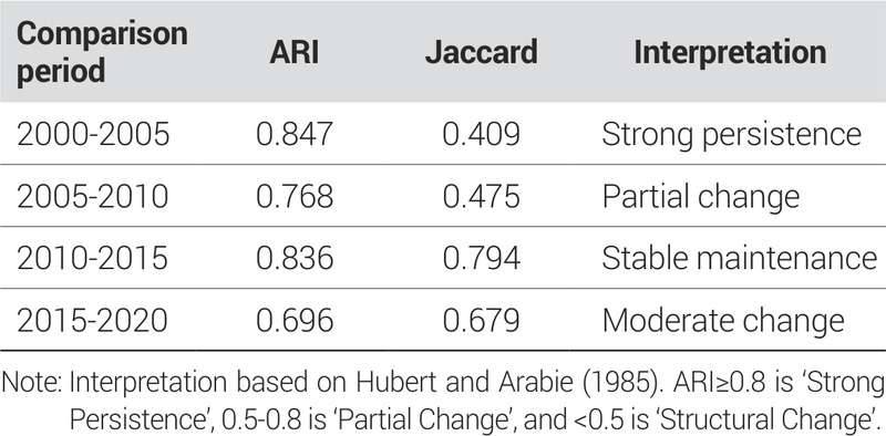중심성의 다차원적 패턴을 유형화하고 그 변화 양상을 체계적으로 분석하기 위해 K-means 군집분석을 실시하였다. 최적 군집 수는 Elbow Method를 통해 결정하였으며, 그 결과 k=4가 가장 적합한 것으로 나타났다. 군집 분석의 타당성은 Silhouette 계수 0.34를 통해 검증하였으며, 이는 중간 수준의 군집 응집성을 의미한다. 연도별 군집의 일치성과 지속성은 Adjusted Rand Index(ARI)와 Jaccard 계수를 통해 평가하였다. 분석의 신뢰성을 확보하기 위해 다양한 검증 절차를 실시하였다. 먼저 중심성 지수 산출에 사용된 가중치의 민감도를 분석하기 위해 기준가중치와 극단가중치를 포함한 총 27개의 시나리오를 설정하여 분석하였다. 그 결과 상위 순위 지역의 변동률이 25% 미만으로 나타나 결과의 안정성을 확인하였다. 또한 다중공선성 문제를 점검하기 위해 분산팽창인수(VIF)를 계산하였으며, 모든 변수에서 3.0 미만의 값을 보여 다중공선성이 없음을 확인하였다. 통계적 신뢰도는 Bootstrap 방법을 통해 검증하였다. 1,000회 반복 추출을 통해 계산된 신뢰구간을 통해 추정값의 안정성을 확인하였으며, 95% 신뢰수준에서 모든 주요 결과가 유의함을 검증하였다. 이러한 엄격한 검증 절차를 통해 연구 결과의 신뢰성과 재현가능성을 확보하였다. 모든 분석은 Python 3.9를 기반으로 하였으며, 공간 분석에는 PySAL 2.7과 GeoPandas 0.12를 활용하였다. 분석 코드와 데이터는 연구의 재현성을 위해 체계적으로 관리되었으며, 이를 통해 향후 연구자들이 동일한 방법론을 적용할 수 있도록 하였다.