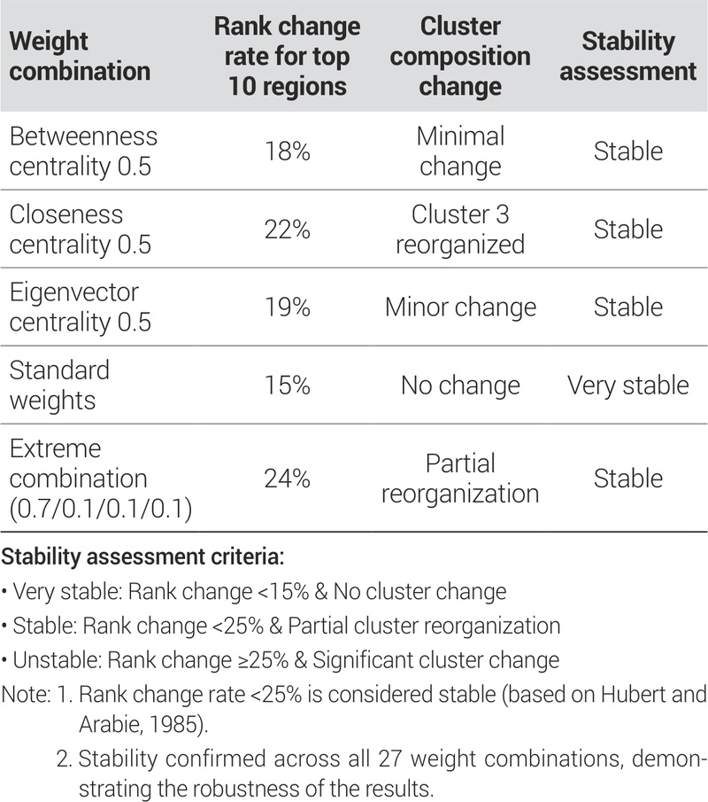 구조적 중심성 분석에서는 27개 가중치 조합에 대한 민감도 분석을 실시하여 결과의 견고성을 검증했다. 분석 결과, 가중치 조합을 달리하여도 상위 지역의 순위는 대체로 안정적으로 유지 되었다. 연결중심성에 0.5의 가중치를 부여한 경우 상위 10개 지역 순위 변동률이 18%로 나타났으며, 매개중심성에 0.5의 가중치를 부여한 경우에도 22%에 그쳤다. 가장 극단적인 조합에서도 순위 변동률이 25% 미만으로 나타나 결과의 안정성을 확인할 수 있었다. 2000년에는 서울 중구, 종로구 등 전통적인 도심 지역의 구조적 중심성이 높게 나타났으나, 2020년으로 갈수록 수원시, 안양시, 성남시 등 경기도 주요 도시의 구조적 중심성이 강화되는 경향을 보였다. 특히 2015년 이후 GTX 등 광역교통망 확충 계획이 발표되면서 주요 환승역이 위치한 도시들의 구조적 중심성이 크게 상승했다. 수원시의 경우 연결중심성이 2000년 0.0234에서 2020년 0.0387로 65.4% 증가했으며, 매개중심성도 2000년 0.0156에서 2020년 0.0298로 91.0% 증가했다. 이는 수원시가 수도권 남부 지역의 교통 거점으로서 역할이 강화되고 있음을 보여준다. 안양시 역시 KTX 광명역과 신안산선 등 광역교통망 연결로 인해 구조적 중심성이 지속적으로 상승하고 있다. 김포시는 김포공항과 김포한강신도시 개발로 인해 구조적 중심성이 급격히 상승한 사례이다. 김포시의 매개중심성은 2000년 0.0045에서 2020년 0.0198로 340% 증가했으며, 이는 인천공항 연결과 서울 서부 지역 교통 허브로서의 역할 강화에 기인한다.
