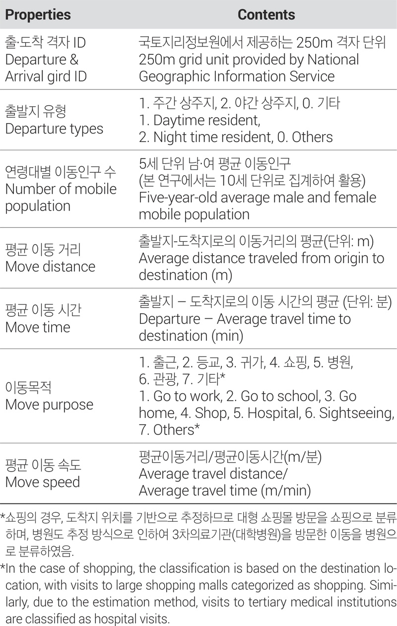 서울시민의 일상생활 이동의 양상을 미시적 단위로 분석하기 위하여 서울시에서 제공하는 수도권생활이동데이터 250m 격자 단위의 OD 데이터를 활용하였다. 이는 KT와 서울시가 협력하여 수도권을 대상으로 시민의 이동을 모바일 통신기기를 활용해 체류지 간의 이동을 250m 격자단위로 제공하는 OD 데이터로, 출·도착지의 격자 ID, 이동량, 이동시간, 이동 거리, 이동목적 등에 대하여 5세 단위 구간으로 제공하며 성별을 구분하여 제공하고 있다(서울특별시 빅데이터담당관·KT AI사업본부 BigData 사업 담당, 2024). <Table 1>과 같이 이동목적은 출·도착지의 특성을 활용하여 추정하여 ‘출근’, ‘등교’, ‘귀가’, ‘쇼핑’, ‘병원’, ‘관광’, ‘기타’로 제공하고 있다. 기존의 생활이동데이터가 행정동을 공간단위로 제공하여 미시적 공간을 분석하는 데 있어 한계가 있었으나, 250m 격자 단위를 통해 시민의 이동을 면밀히 파악할 수 있다. 본 연구에서는 서울시민의 보행이동 양상을 시간적·공간적 범위로 탐색하기 위하여 2024년 3월 한 달간의 이동 중 출발지 및 도착지가 서울시에 해당하며 ‘평균 이동 시간’이 30분 이하인 이동을 10대~60대까지 10세 단위로 이동량을 집계하여 정제하였다. 보행이동은 ‘평균 이동 거리’와 ‘평균 이동 시간’을 통해 ‘평균 이동속도’를 계산하였다. 10대에서 60대의 보행속도가 1.3~1.6m/s이며(박세진 외, 2007) 이를 m/분으로 환산하였을 때 78m/분~96m/분으로 나타났는데, 이는 「2030서울생활권계획」에서 서비스시설의 공급현황분석 시 일반인의 보행속도 기준으로 삼고 있는 80m/분을 포함하고 있어 본 연구에서도 이를 기준으로 하여 평균이동속도가 80m/분 이하를 보행이동으로 간주하였다.