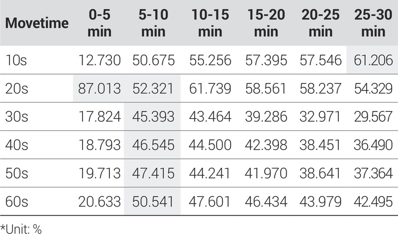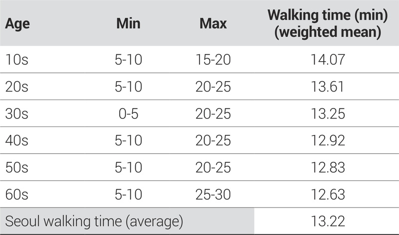 먼저 서울시민 보행이동 현황분석에서 서울시민이 보행으로 이동하는 시간적 범위에 대해 검토하였다. 연령대별 이동에 대하여 0-30분을 5분 간격으로 분류하여 각 시간대별 보행이동비율 집중도와 30분 이하의 목적별 보행이동비율을 분석하여 연령대별 보행이동 시간적 범위의 차이를 확인하고, 서울시의 연령대별 ‘n분’ 보행이동 시간을 도출하였다.